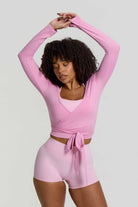 Designed for graceful layering and studio comfort, our Ballet Wrap Top is made from a super soft, lightweight fabric that moves effortlessly with your body. The adjustable wrap tie lets you shape and secure the fit to your waist, while the long sleeves and clean neckline create an elegant, minimal silhouette. Perfect to throw on before, during, or after Pilates.